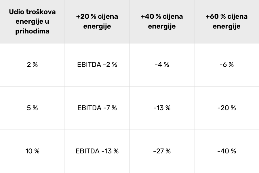 Ako cijena energije poraste, učinak na EBITDA može se procijeniti jednostavnom formulom:
